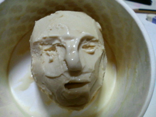 さあ!これがアイス顔らしいですよ!なんてことはない、アイスに顔を彫り込むという事ですね。しかしね〜、これなかなか難しいですよ。見てくれこの 不細工 を!!!